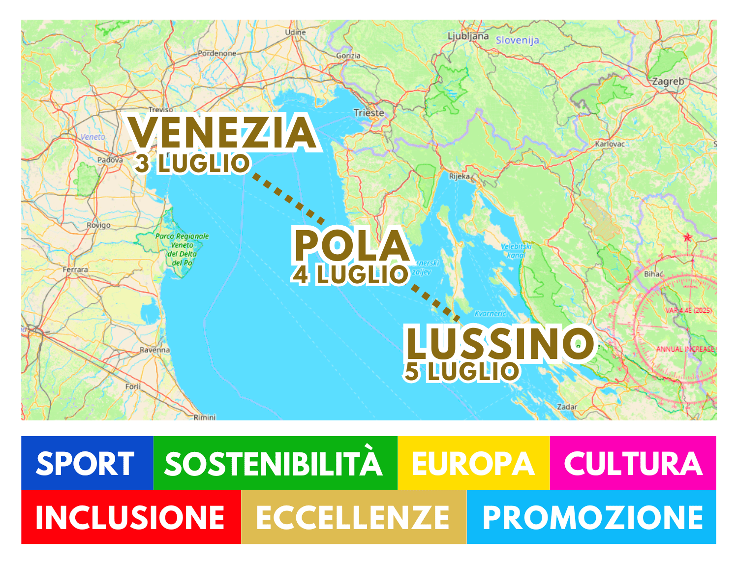 Partenza da Venezia e arrivo a Lussinpiccolo, dopo la tappa intermedia di Pola seguendo le antiche rotte veneziane della Serenissima in onore dell’Ammiraglio Agostino “Tino” Straulino, nativo di Lussinpiccolo, Comandante della Vespucci, Oro Olimpico e leggenda della vela. Nella sua prima edizione è dedicata a Go! 2025 Capitale Europea della Cultura 2025 Nova Gorica Gorizia.